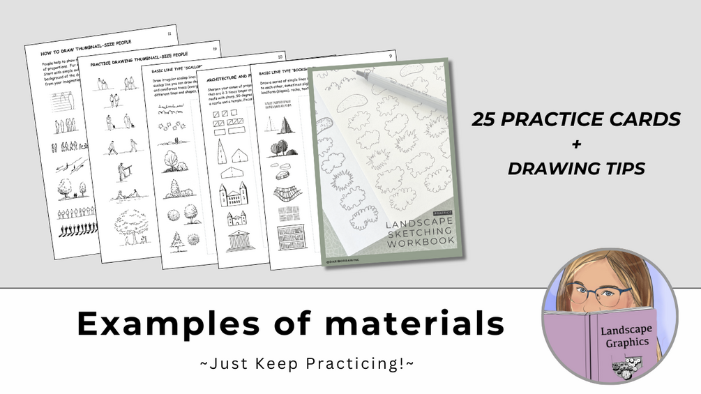 26 practice cards in PDF and PNG format to practice basic line types, vegetation, people and perspective.